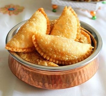 Traditional snack made by stuffing coconut based filling in a flat rolled maida dough and deep fried.