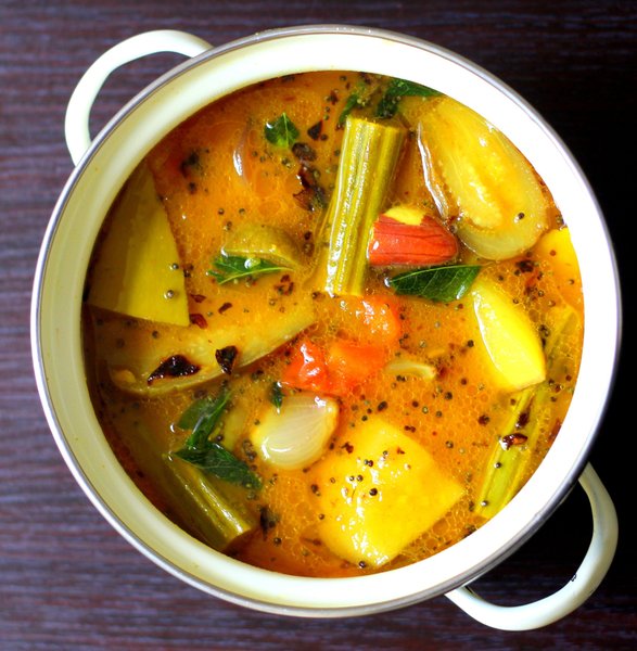 A flavorful South Indian sambar made with a medley of vegetables and raw mango, simmered in aromatic spice
