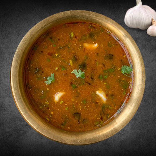 Veluthulli Rasam is a flavorful South Indian soup made with garlic, tamarind, and spices, served hot.