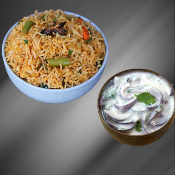 Fragrant spiced rice loaded with vegetables, served with refreshing onion raitha.