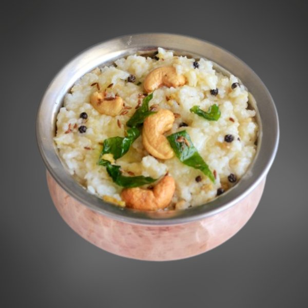 Ven Pongal is a traditional South Indian dish made with rice, split yellow mung dal, ghee, cumin, ginger, pepper and curry leaves.
