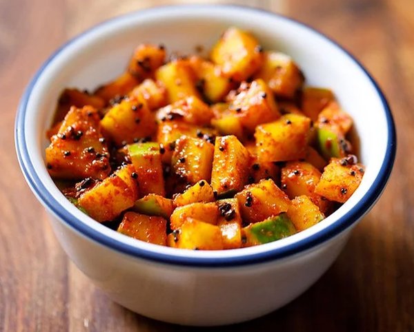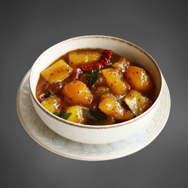 Kalyana Mango Pickle is a traditional South Indian-style raw mango pickle served at weddings, known for its bold, spicy, and tangy flavor.