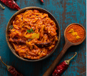 A tangy South Indian curry with drumsticks and brinjal in a tamarind-spiced gravy.
