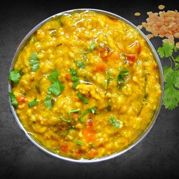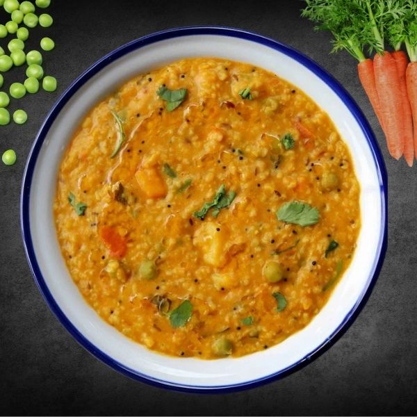 home style Dal Khichdi with Carrot and Peas, tempered with desi ghee