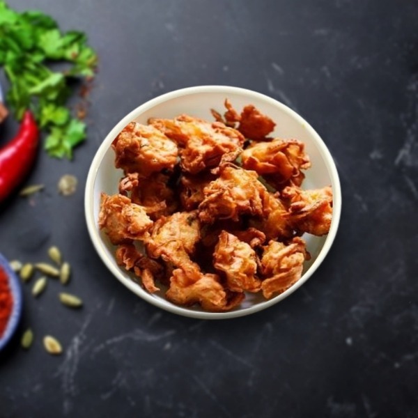 aAcrispy, deep-fried South Indian snack made with sliced onions coated in a spiced gram flour batter.