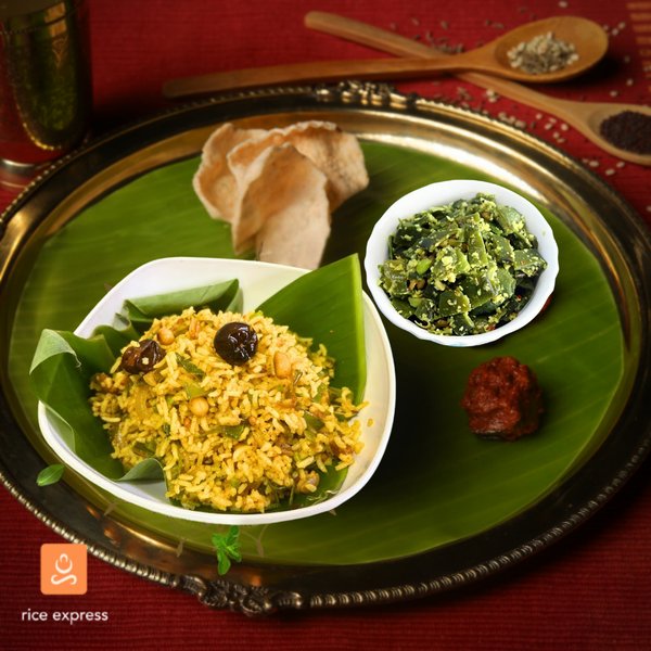 Tailored for taste , home made for moments , a tangy and spicy mix of sorrel leaf pulihora along with hot and spice andra karam rice, with vegetable side.