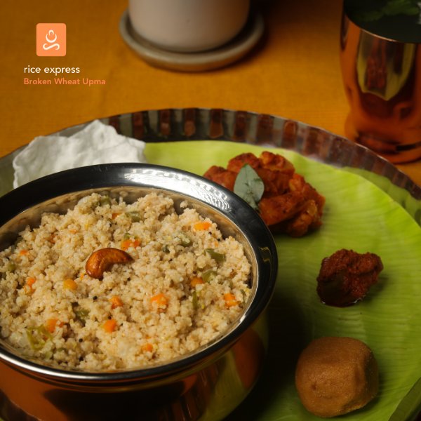 Nutritious cracked wheat and horsegram suitable for all time tiffen + 1 Veg Fry + Fryums + Pickle + Drink + Traditional Dessert.