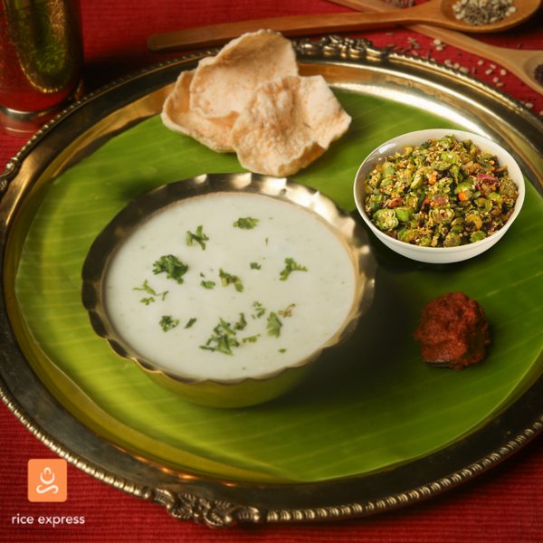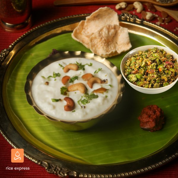 Authentic with a touchh of luxury , a creamy curd rice topped with crunchy roasted cashews and vegetable dry