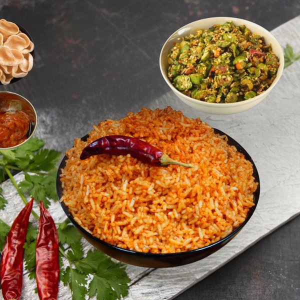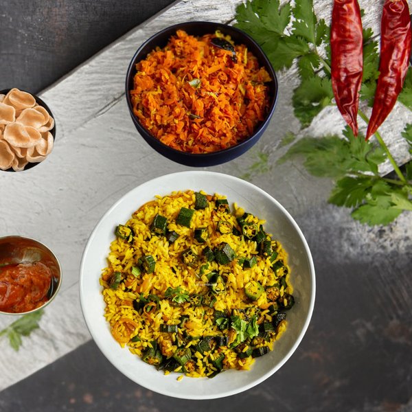 A tasty rice dish made with lady's finger and mild spices + veg dry