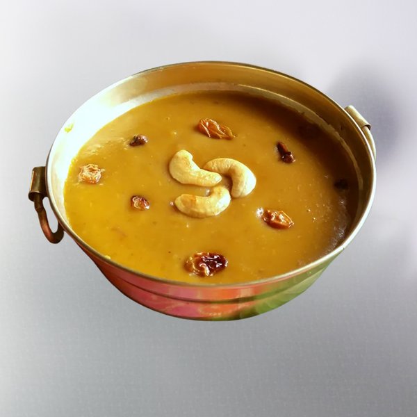 Evokes cozy , home sweet memories , a creamy dessert made with moong dal and jaggery.