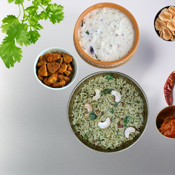 Family style prepared combo meal of mint coriander variety rice and creamy curd rice paired with veggies